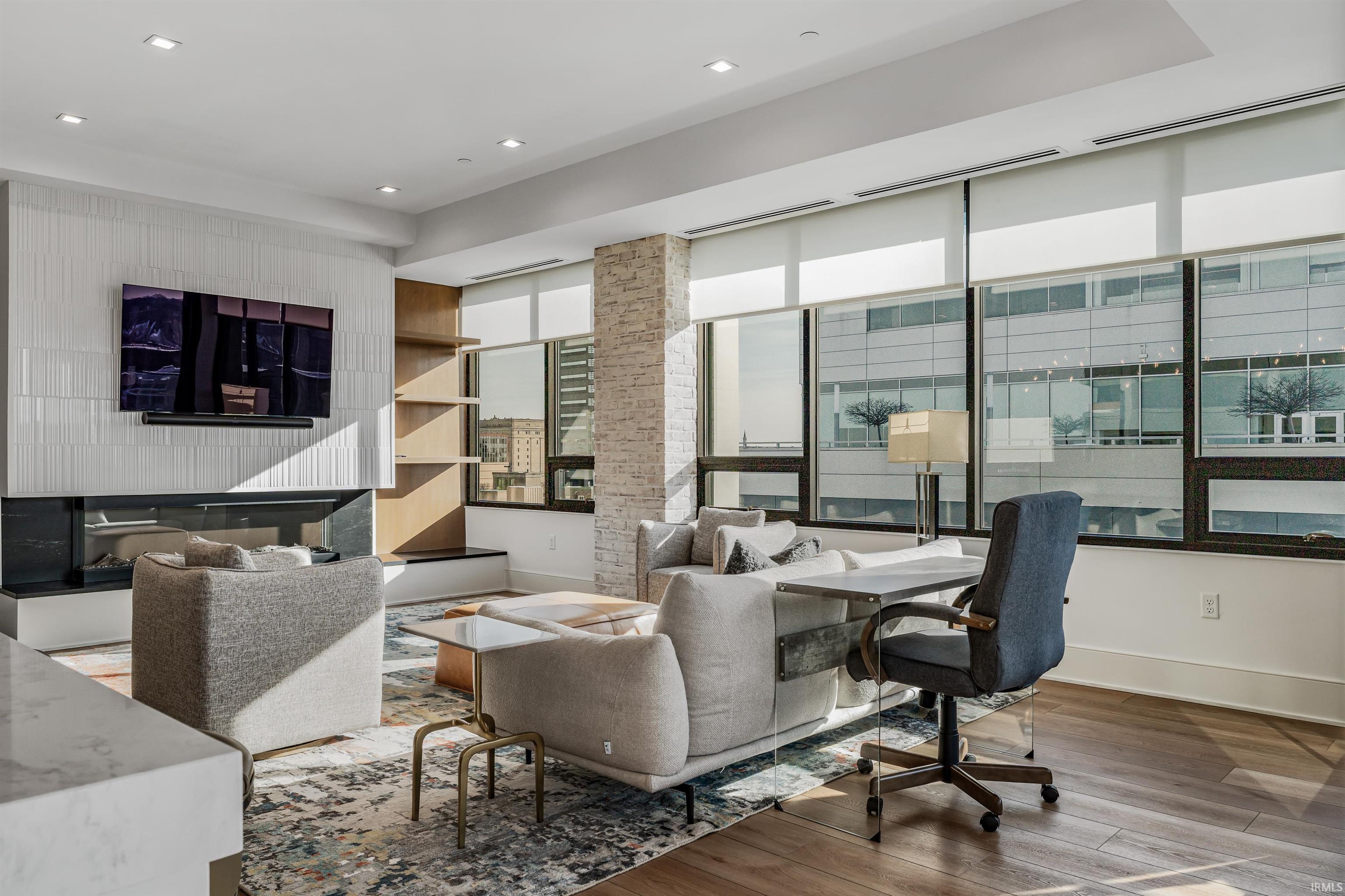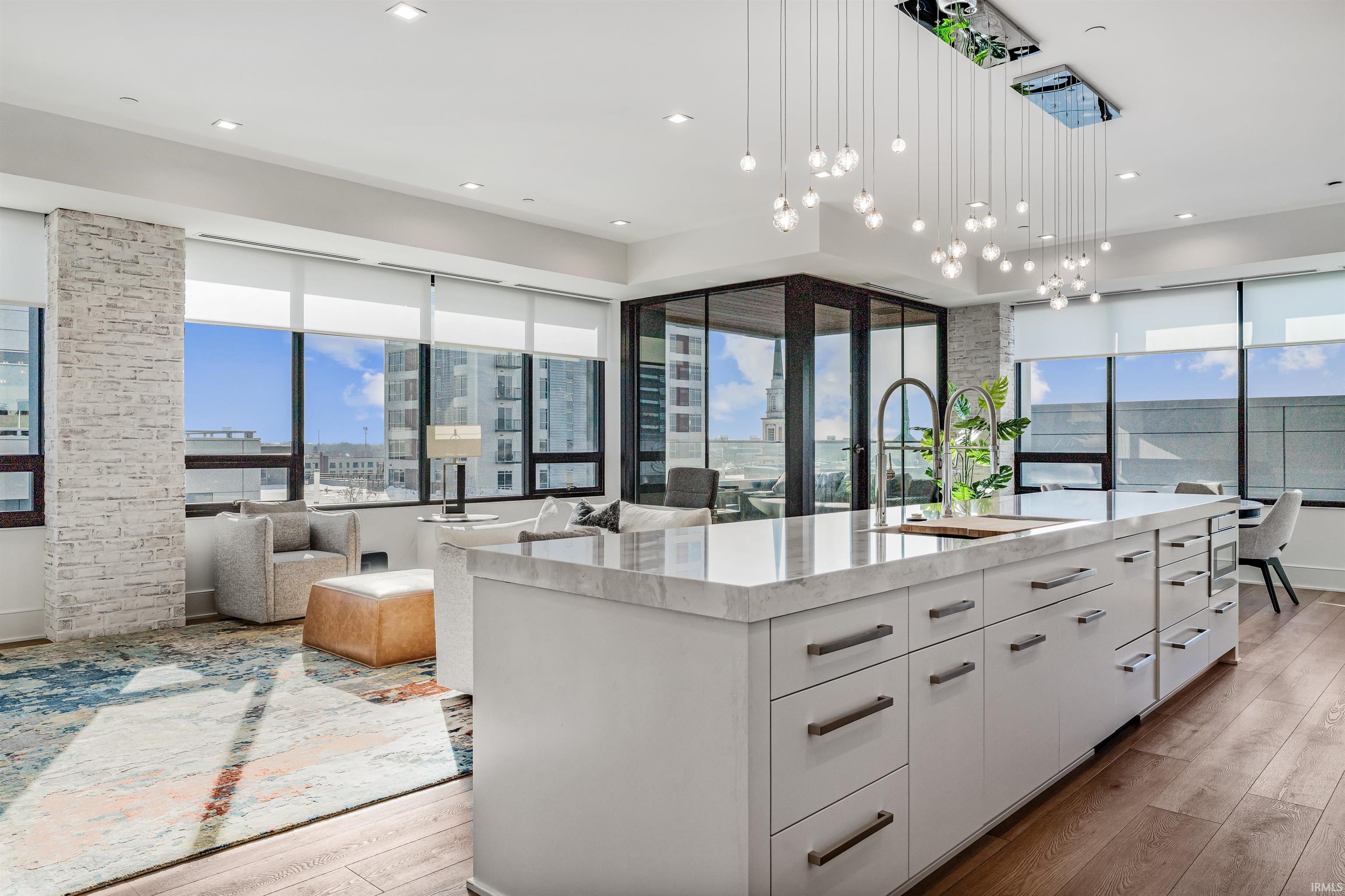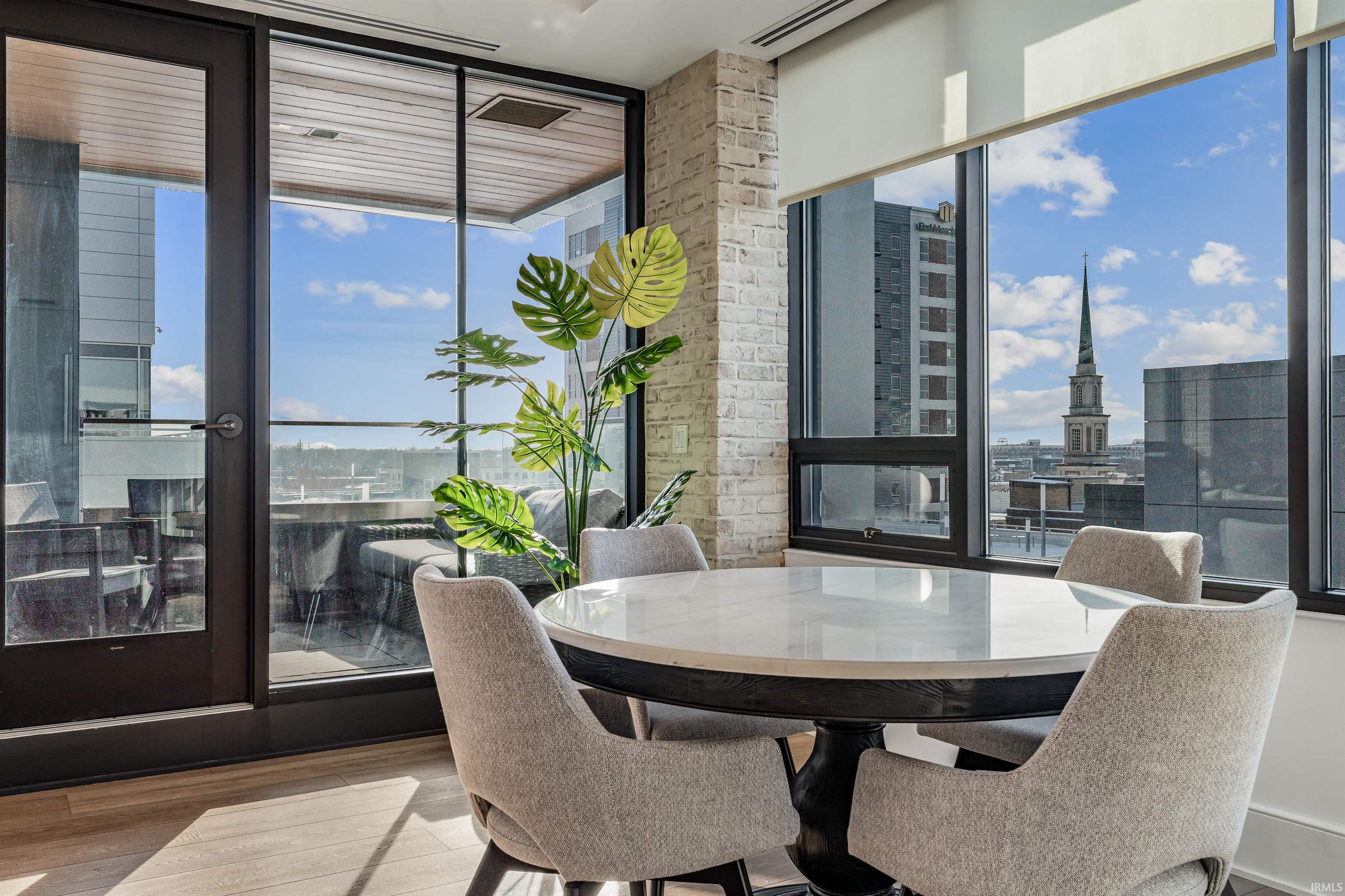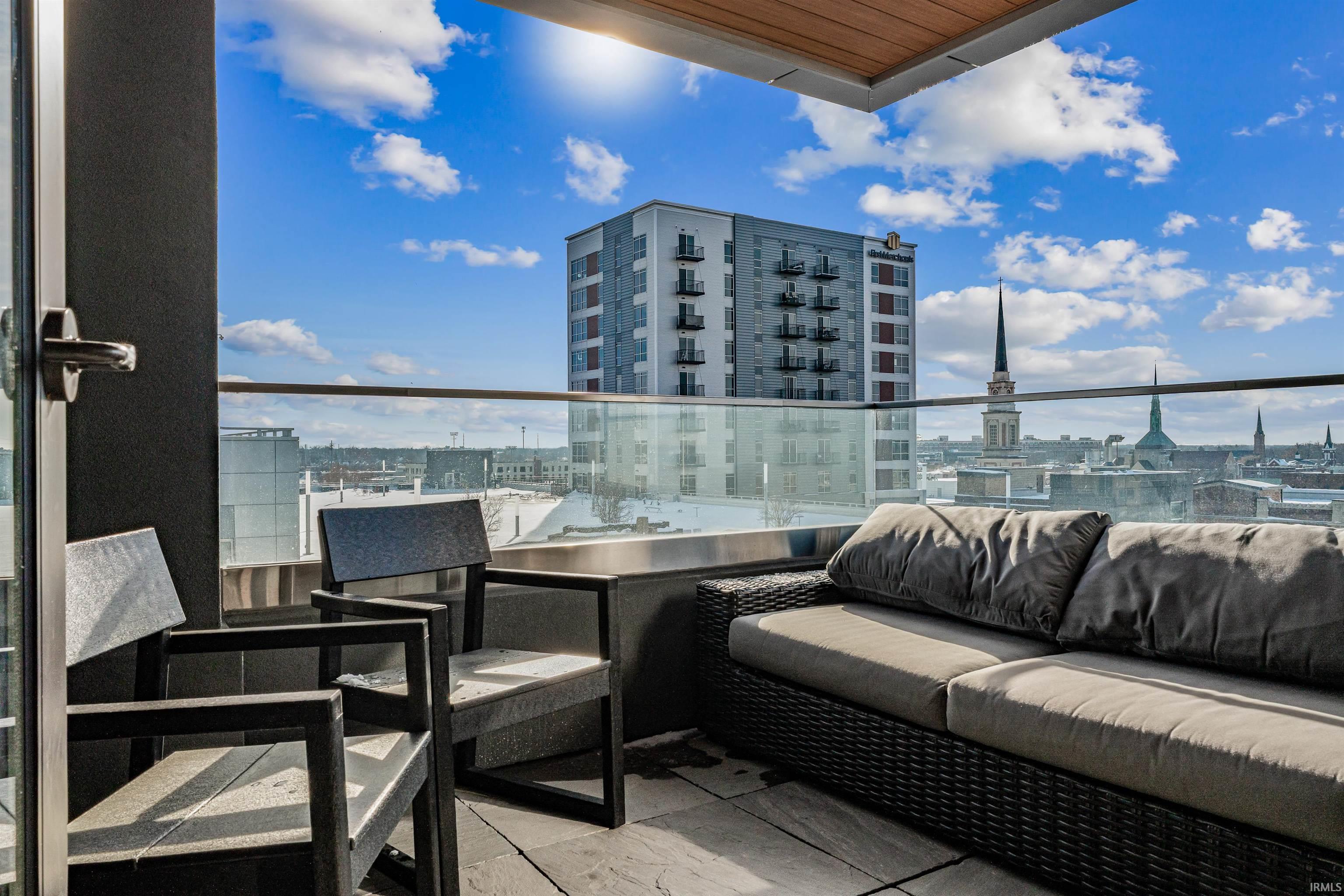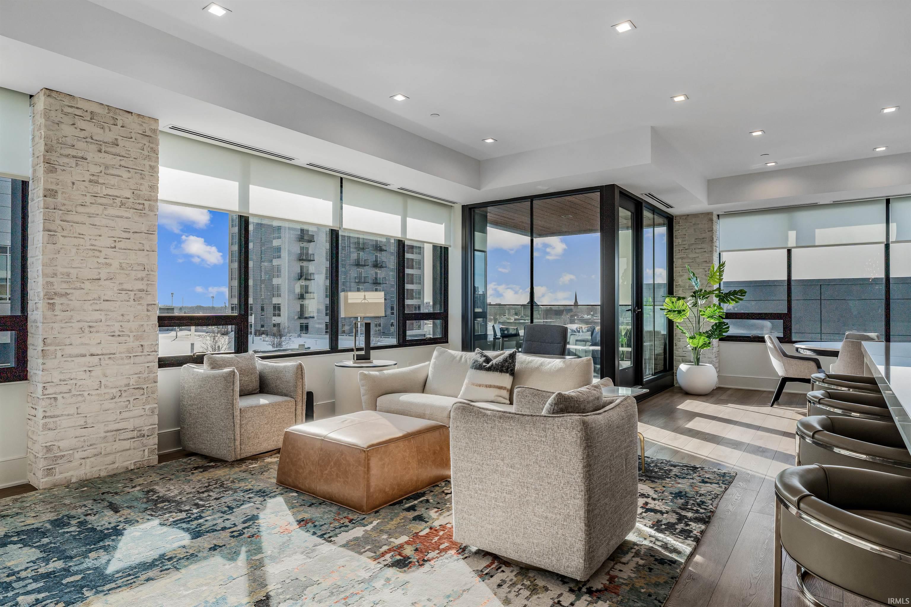 Welcome to downtown Fort Wayne living at its finest—an effortlessly stylish retreat perched above the city in the coveted Metro Building. Curated by renowned designer Frank Souder and brought to life with RW Robrock’s impeccable craftsmanship, this chic 2-bedroom, 2.5-bath residence captures unparalleled skyline views from every room, along with private parking, exclusive rooftop amenities, and instant access to The Landing, Promenade Park, and some of the city’s most celebrated dining. Modern luxury and turn-key sophistication shine in every high-end, high-tech detail. Unit #710 unfolds with generous room sizes and sweeping west-facing vistas—sunsets included—all the way to the Electric Works campus & unobstructed views of the TinCaps fireworks. The chef’s kitchen is a true showpiece, thoughtfully planned with professional-grade appliances, custom cabinetry, a sprawling island/breakfast bar, premium natural stone selections, quartz surfaces, and a swanky butler’s area ideal for entertaining. Both bedrooms offer sleek en-suite retreats featuring tall ceilings, natural stone finishes, under-vanity lighting, and impressive storage. The primary suite elevates the experience with dual walk-in closets, a garden tub, heated tile floors, and an expansive tile walk-in shower. A lovely west-facing veranda, spacious laundry room, and a dreamy half bath complete the interior. Includes two deeded parking spaces (valued at $90,000) in the secure, private garage with a car wash station, plus additional storage available for rent. Residents of the ultra-lux Urbana Condos enjoy access to a beautifully designed rooftop space with grill, pergola, and firepit; priority-dispatch elevators; a state-of-the-art fitness studio; private parking; and a dedicated conference and recreation area. A rare blend of design pedigree, effortless comfort, and unmatched urban access—this is downtown living reimagined.